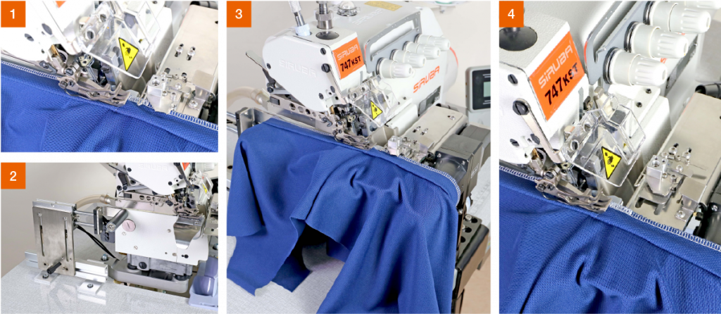 Specjalistyczna 4-nitkowa cylindryczna owerlokowa maszyna do szycia kołnierzyków T-shirt z automatycznym pozycjonowaniem kołnierza.